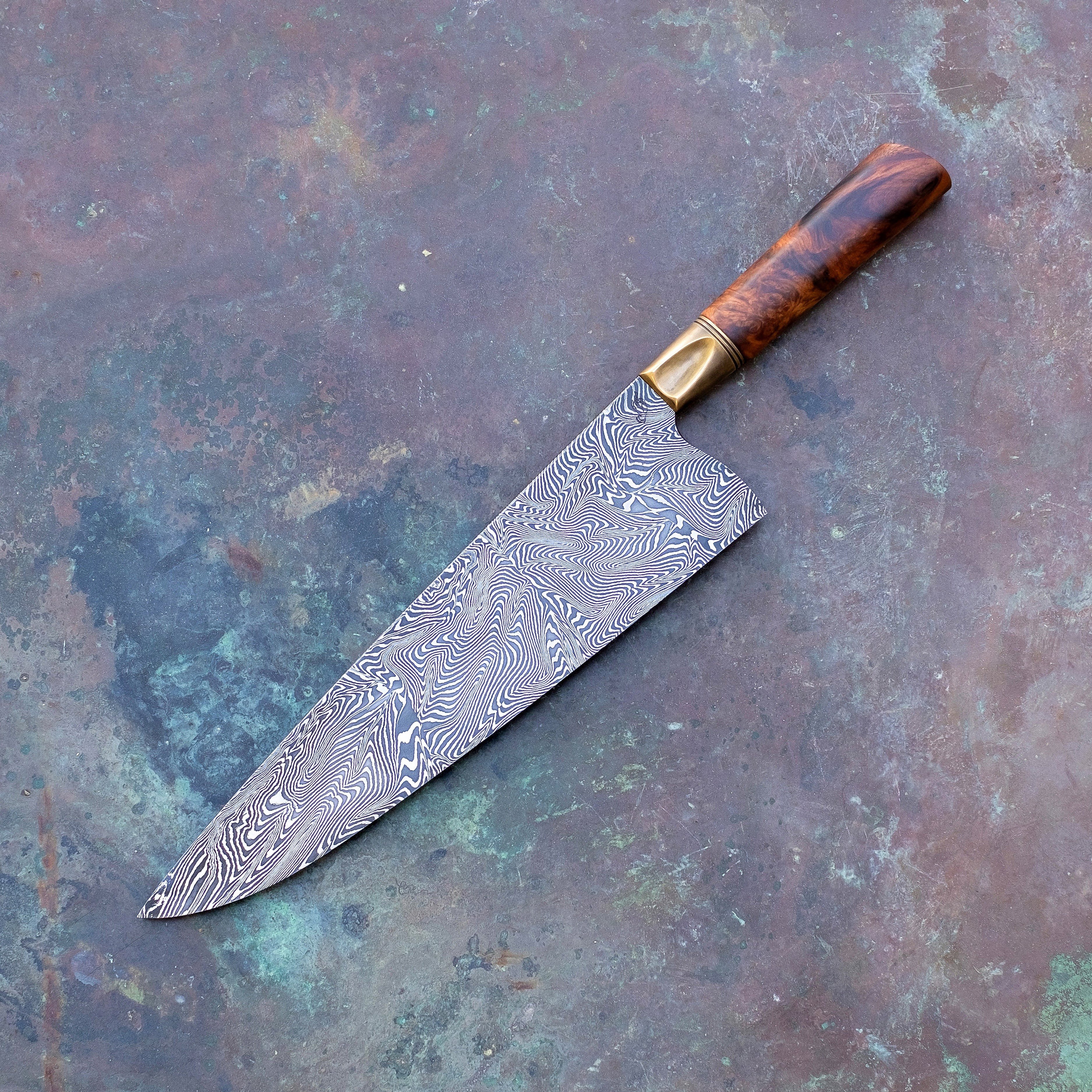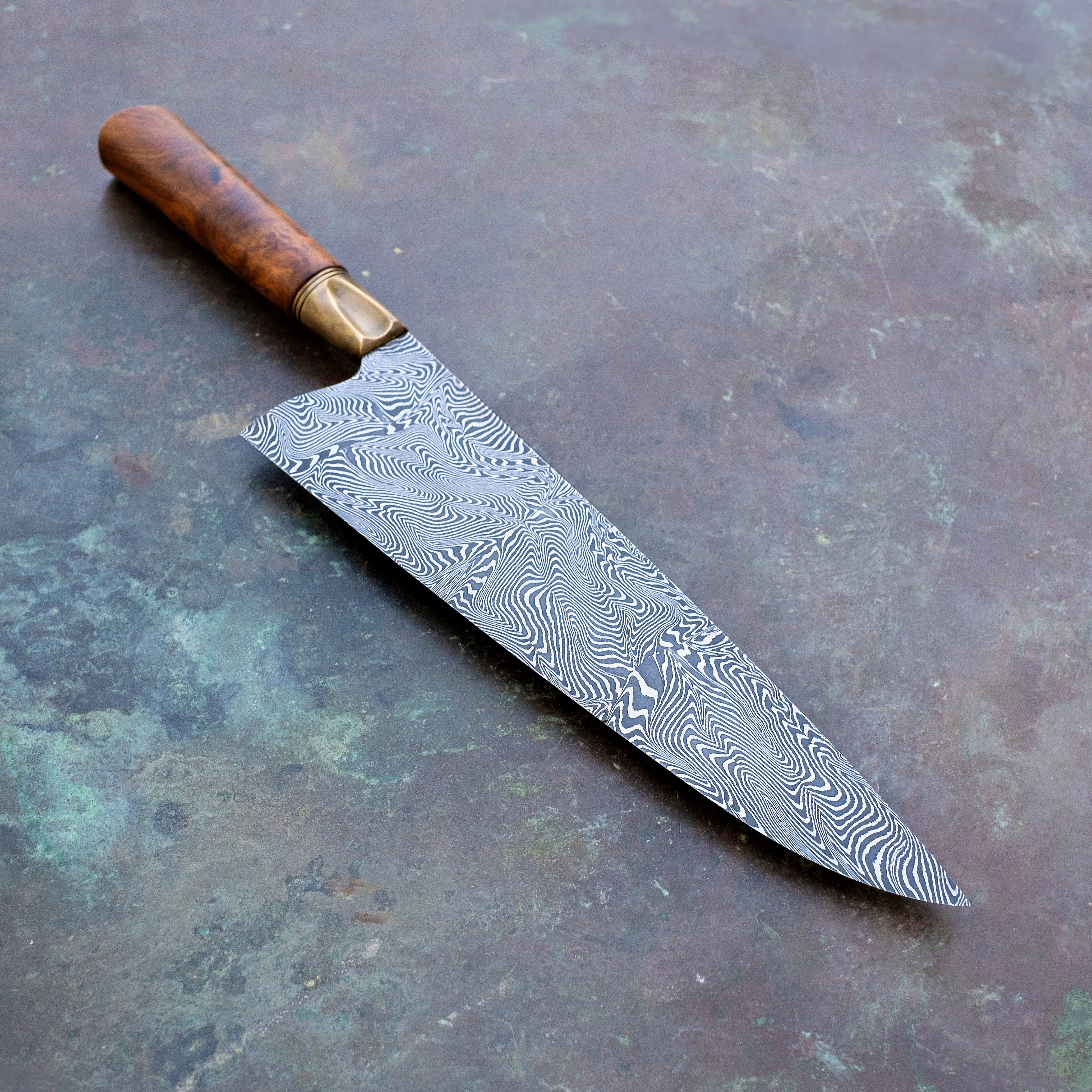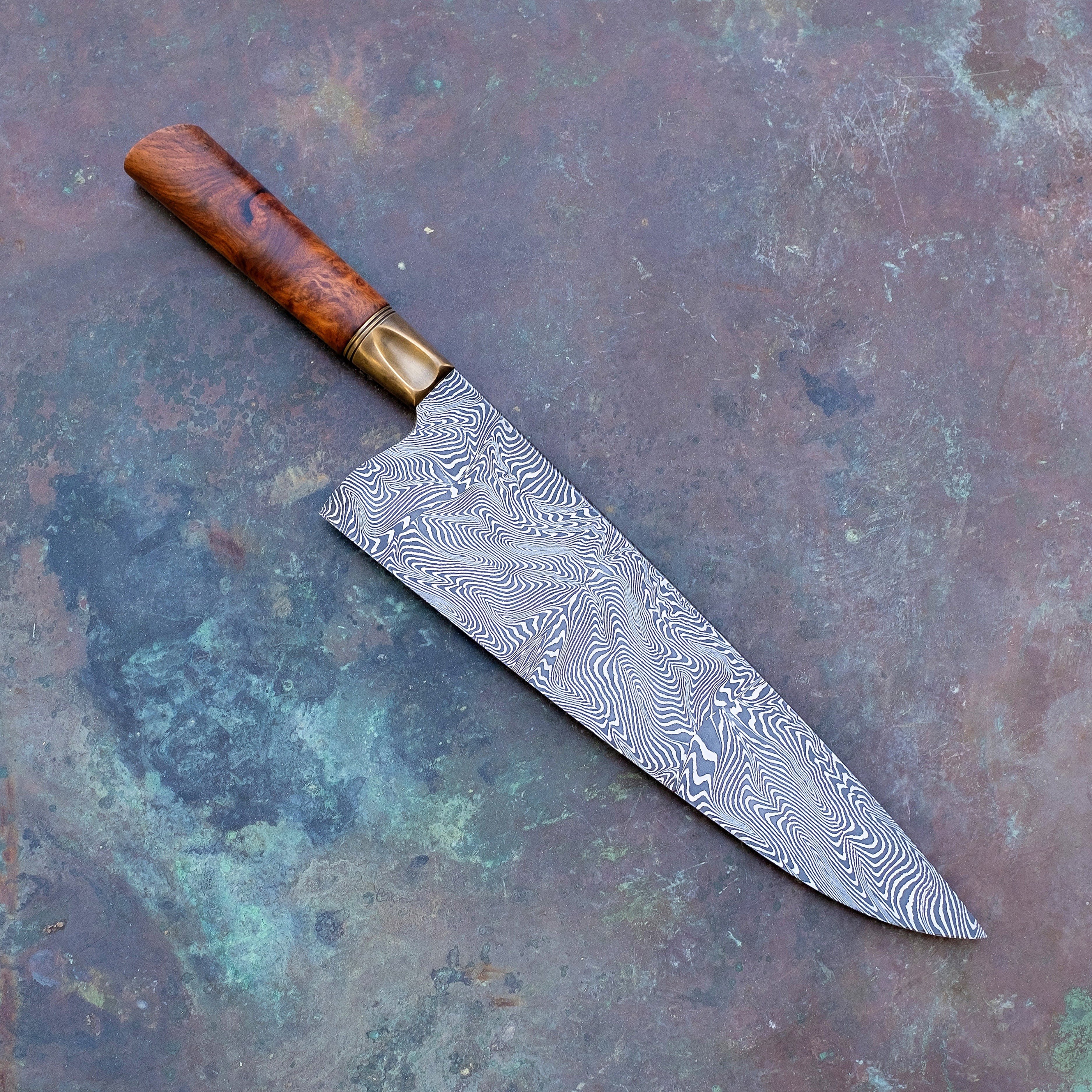 "Infinite Portal No. 1" Mosaic Damascus Chef Knife is the beginning of my journey into the intricate world of Mosaic Damascus. This piece is the first of its kind, representing my deep dive into the art of fine pattern-welded steel. I plan to explore this craft for years to come, but this knife marks the very first step in that journey. It’s more than just a chef knife—it's an experiment in a new medium offering a glimpse of what lies ahead in my exploration of this ancient art.